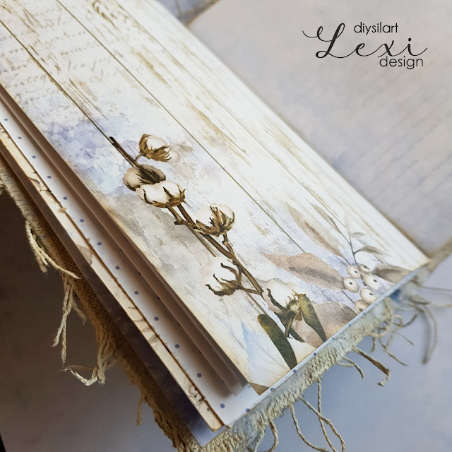my name is diysilart it's. I would like to show you notepad with 'Midori' style format, made on a textile album, decorated with rice paper, with three inner scrap paper notebooks and white sheets.