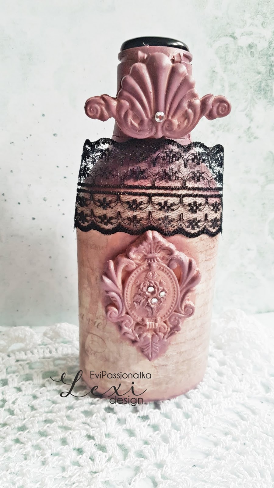 Wystarczy papier ryżowy, odlewy z żywicy, koronka, farby akrylowe i kilka ozdobnych dżetów, oraz kamień na nakrętce.